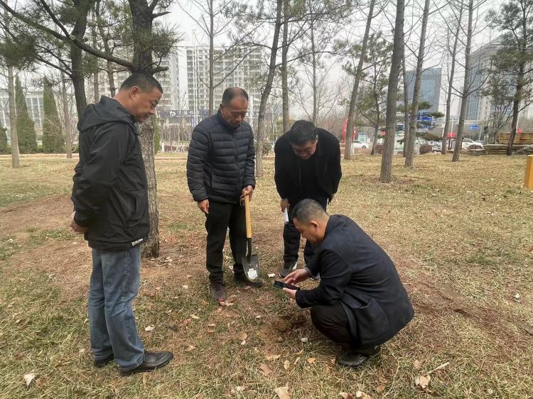 落脚于“实”,强化督导。市城管局定期对各养护片区“返青水”浇灌工作进行实地督导巡查,在各片区针对已完成浇灌的作业区域,随机选取3-4处点位,用土壤湿度检测仪对土壤表面及深度15cm以下土层进行采样,实时监测绿地湿度,并就监测到的土壤湿度、含盐量等参数,与各片区科室负责人、园林绿化养护企业负责人进行现场沟通,同时就下一步浇灌工作提出改进建议。