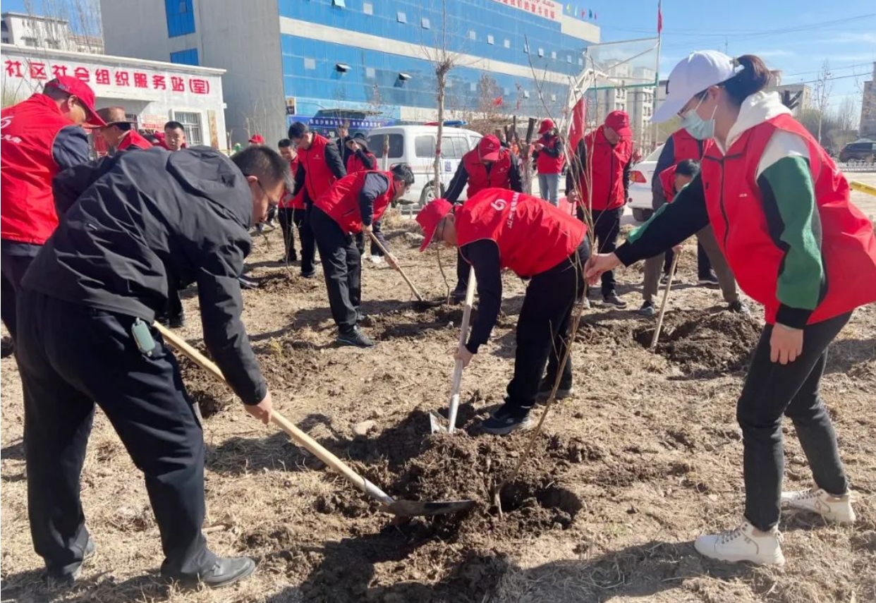 在英吉沙县创业社区,济宁援疆指挥部志愿者服务队与社区干部一同开展植树绿化活动。挥锹铲土、扶树填坑、踏土夯苗、合力浇水,现场一派热火朝天的劳动景象。全体援疆干部人才和社区群众相互协作、紧密配合,共同种下了100余棵树苗,为社区增添了绿意。
