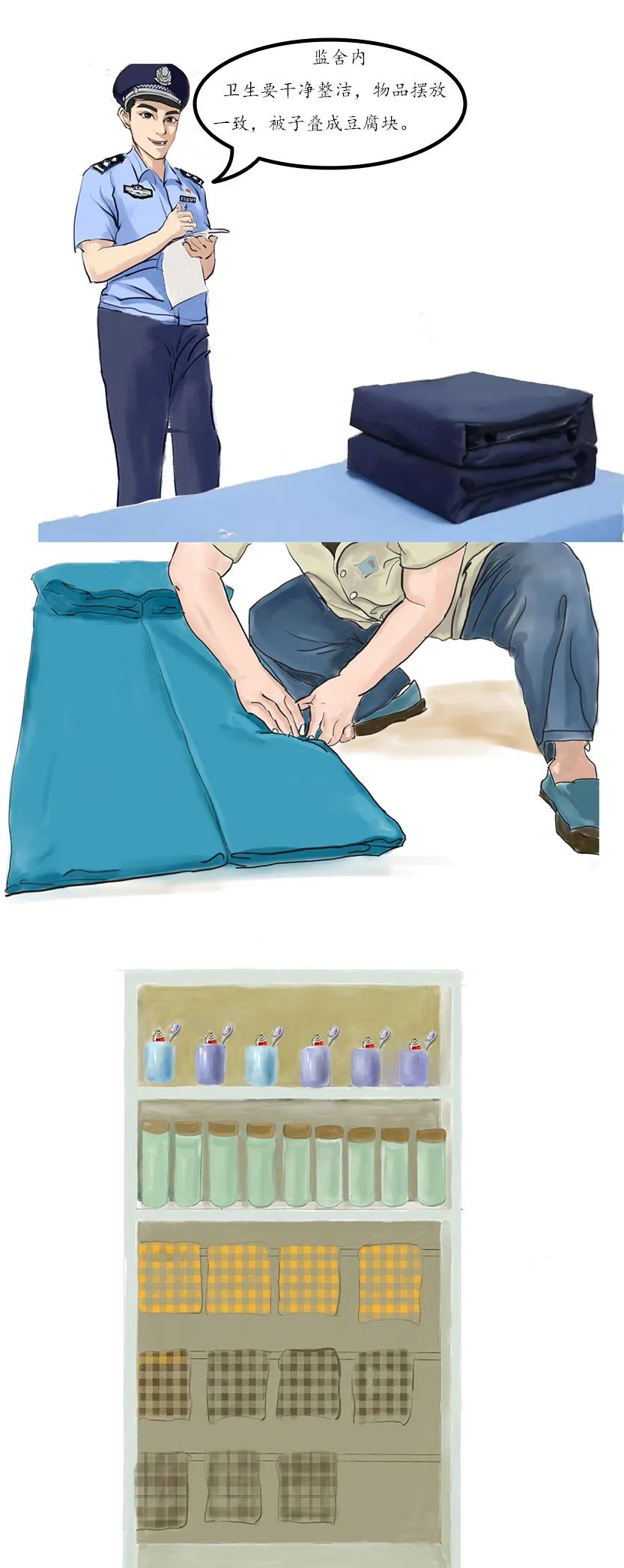 监狱的内务管理,主要是指集体生活室内的日常事务,如整理床铺、叠被子、按规定放置衣物、卫生清洁等。罪犯内务要严格落实准军事化管理要求,统一规范内务标准,被子折叠大小统一,长宽比例一致,棱角分明,洗用品、生活用品等摆放整齐划一。