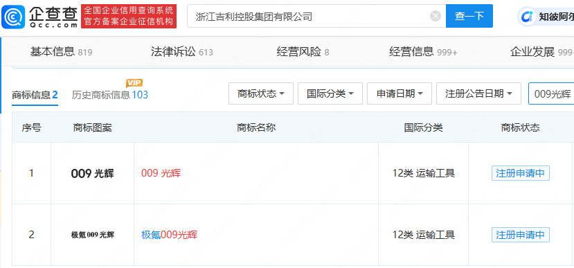 据媒体报道,极氪将推出全新车型极氪009光辉,这款新车定位为“四座超豪华旗舰”,聚焦四座豪华出行领域。据企查查APP显示,此前,浙江吉利控股集团有限公司已申请注册“极氪009光辉”“009 光辉”商标,国际分类为运输工具,当前商标状态均为注册申请中。(企查查)