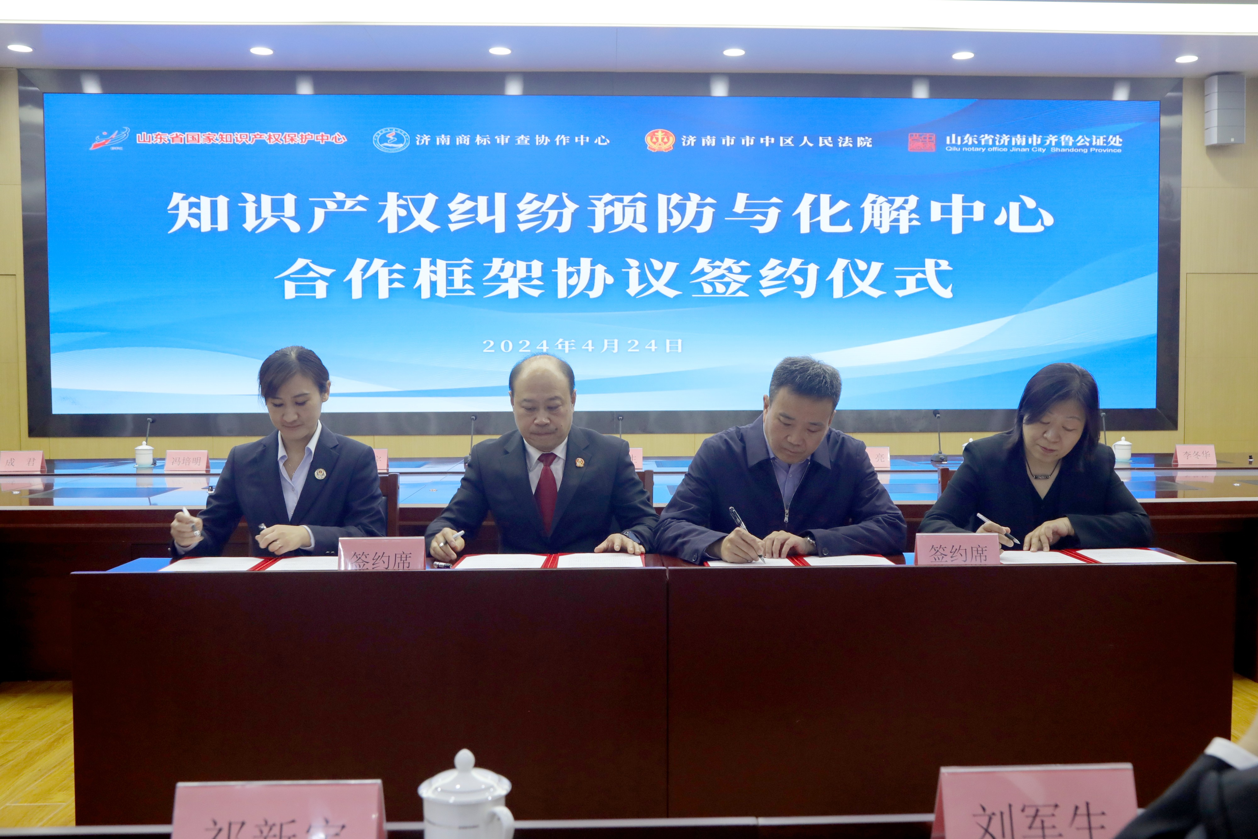 祁新宇、成君、王亮和张坛共同签署了“知识产权纠纷预防与化解中心”平台合作框架协议,进一步深化完善多元化纠纷解决机制,凝聚多方合力参与纠纷化解,推动提升诉源治理效果。