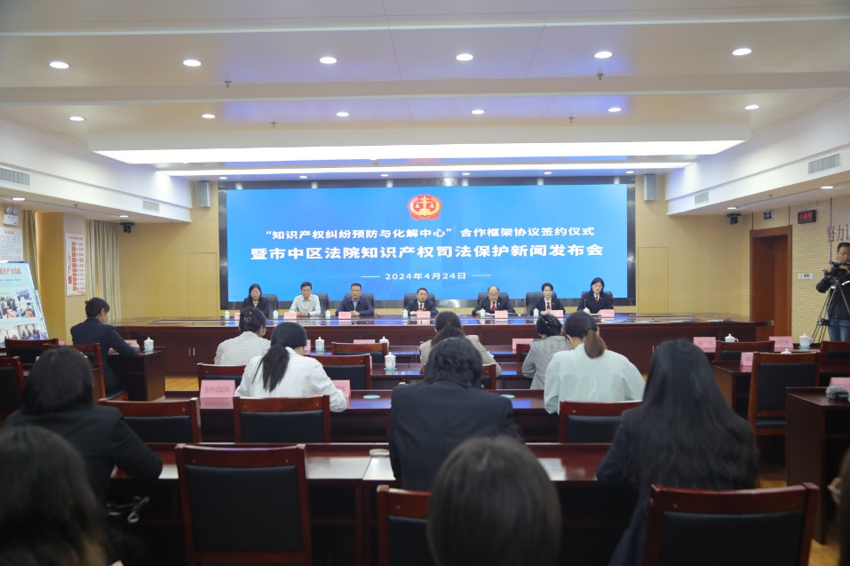 4月24日,在第24个世界知识产权日即将到来之际,济南市市中区人民法院举行“知识产权纠纷预防与化解中心”合作框架协议签约仪式暨知识产权司法保护新闻发布会。济南中院知识产权法庭庭长刘军生,山东省国家知识产权保护中心副主任祁新宇,济南商标审查协作中心业务运营部部长成君,市中区法院党组成员、副院长王亮,齐鲁公证处党支部书记、主任冯培明,齐鲁公证处副主任张坛,市中区法院立案庭庭长韩晓爽等出席会议。市中区法院审判管理办公室副主任李冬华主持会议。