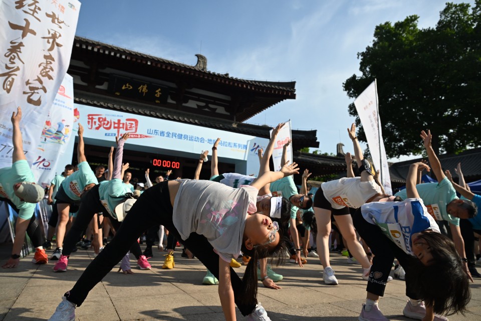 (记者 张中 济南报道)4月27日,“乐跑中国 绿动齐鲁”2024山东省全民健身运动会·地标马拉松系列赛在济南千佛山鸣枪开跑。赛事开始前,啦啦队与健身教练带领跑友们开始热身,现场热情满满,动感十足。