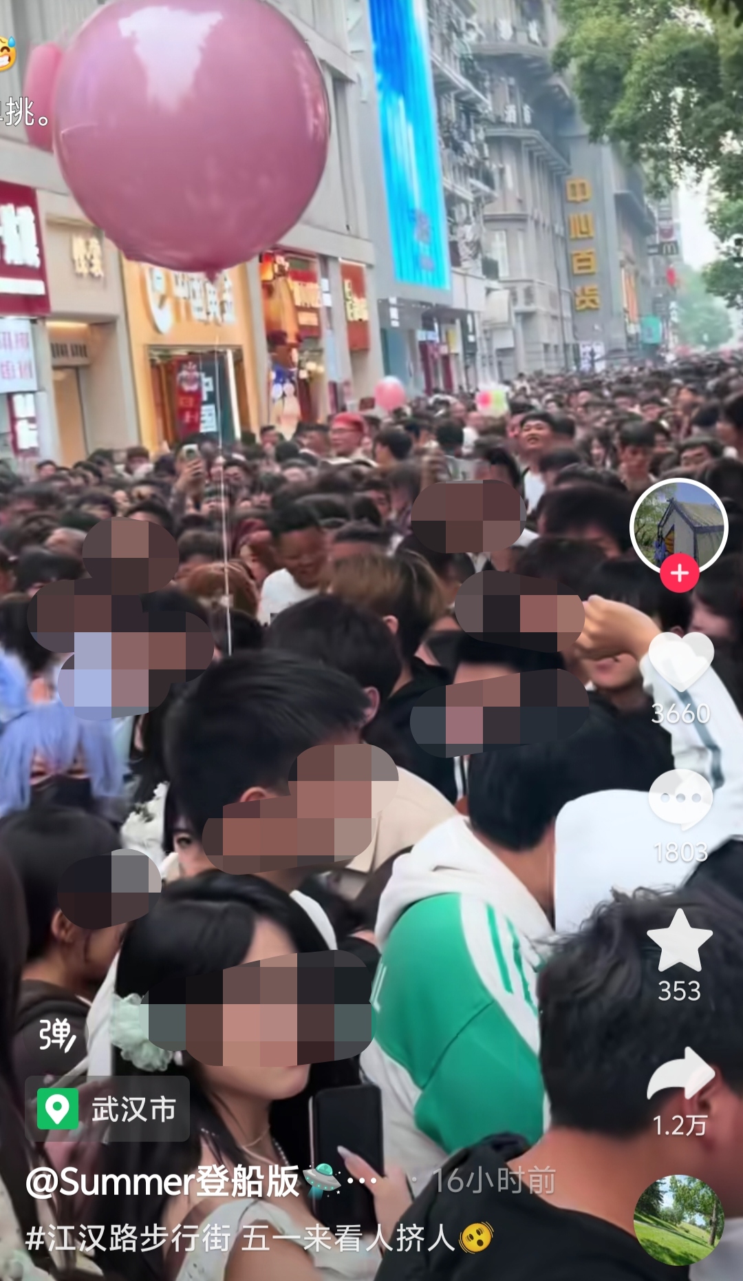 网友晒出五一当天江汉步行街人流