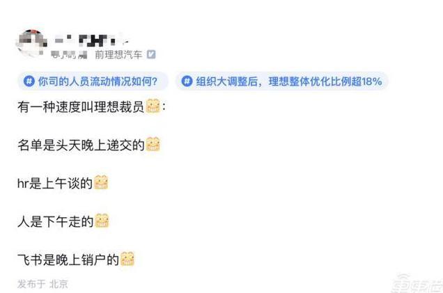 据脉脉上理想前员工透露,本次裁员是头天晚上确定名单,第二天上午与相关员工谈话,下午员工便已离职,同时其相关飞书账户就已经销号。