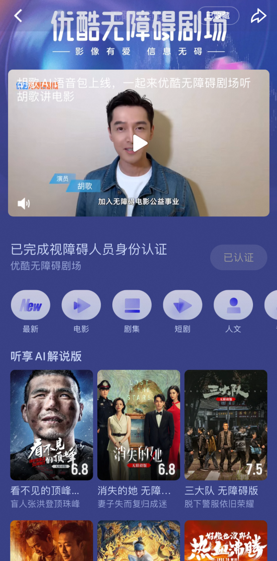 胡歌献声优酷无障碍剧场,为视障用户讲解《消失的她》等10余部影片