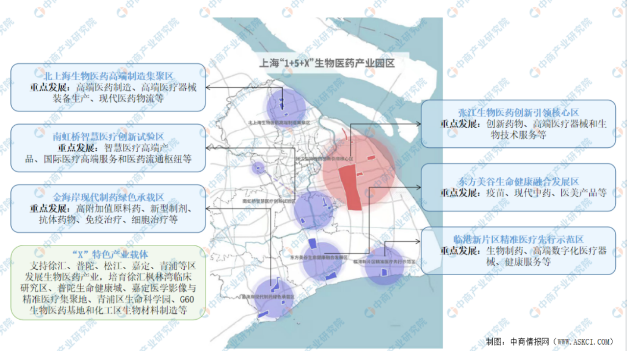 科学的产业生态布局。实施“1+5+X”生物医药产业园区布局:其中,“1”是指张江生物医药创新引领核心区,“5”是指五大特色产业区,“X” 是指若干特色产业载体,生物医药产业主要集中在浦东新区、宝山区、闽行区和松江区,生命健康产业主要集中在徐汇区和金山区,美丽健康产业主要集中在奉贤区,高性能医疗设备、精准医疗主要集中在嘉定区。