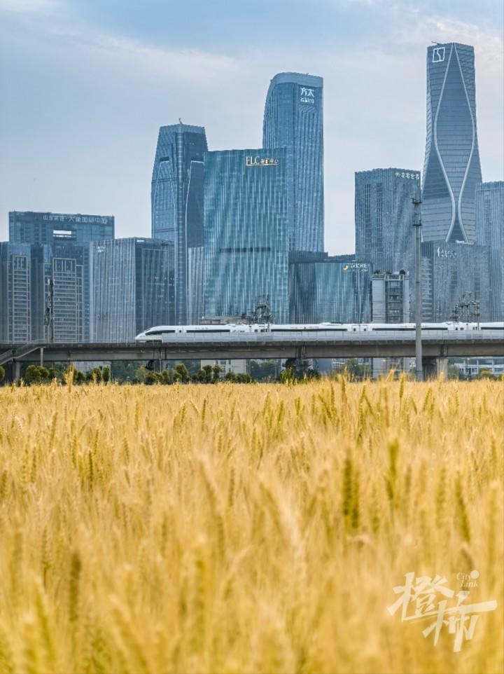 钱江世纪城,一边是高楼大厦,一边是希望的田野,高铁从麦田上穿过,构成独有的美景。