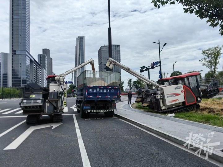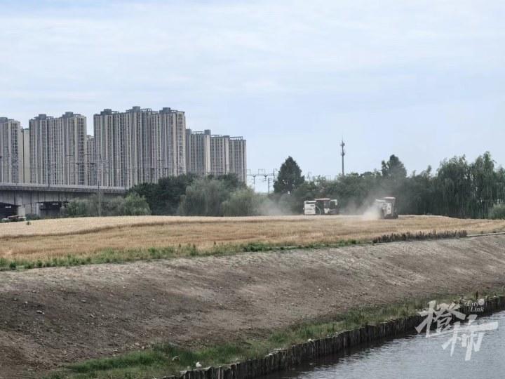 一位正在收割的工人告诉记者,他们已经忙了两三天,钱塘江边的麦田已经收完,靠近盈一佳苑和盈二佳苑那一大片也收好了,“今天这一片(亚运村东)收完,南边铁路(高架)底下还有几片,几十亩吧,这两天也能收完……”