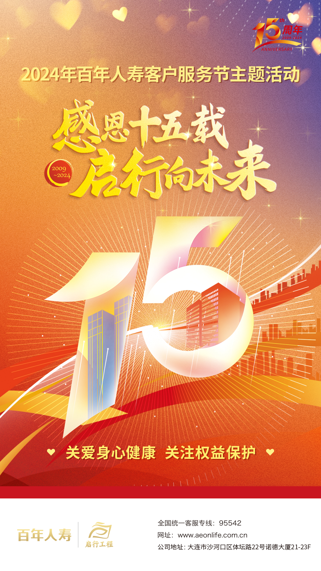 百年人寿将始终秉承以客户为中心理念,为客户提供全生命周期的保险保障服务,以专业和价值创百年老店,不负客户每一份信任与期待。“感恩十五载,启行向未来”2024年百年人寿客户服务节活动,已在全国300余家机构火热开启,期待您的参与。