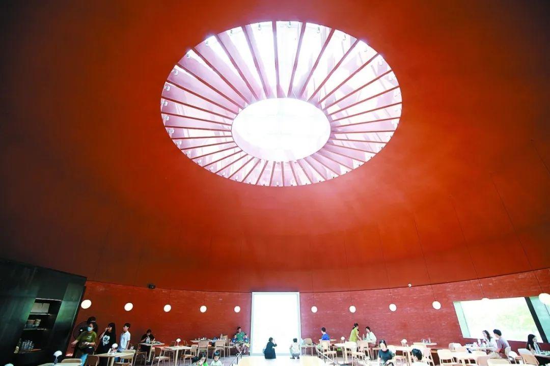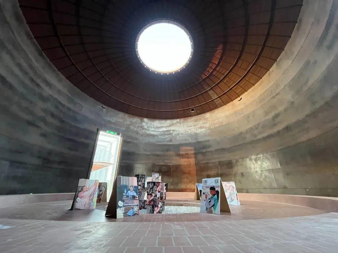 开放式连廊将4个油罐连通步入油罐,就如同进入一个神奇的玻璃空间。油罐的巨大穹顶上,圆形空洞与地面圆形的下沉式空间互相呼应,阳光透过顶部的空洞洒在地面上,很是壮观。
