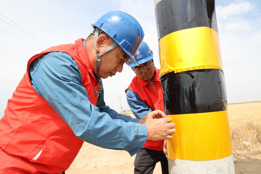 6月11日,在潍坊寿光市营里镇的小麦种植区,国网寿光市供电公司彩虹党员服务队队员王增贞、郝导奎早早地就来到田间地头。他们肩负着重要的任务,那就是对麦田附近的电杆进行粘贴防撞贴、安装拉线护套等防护措施。在麦收的高峰期,收割机等大型机械忙碌地穿梭在田间,如果不加以防护,很容易误碰电力设施,造成倒杆断线等严重后果。王增贞和郝导奎深知责任重大,他们认真地完成每一项防护工作,确保麦收期间供电安全可靠。
