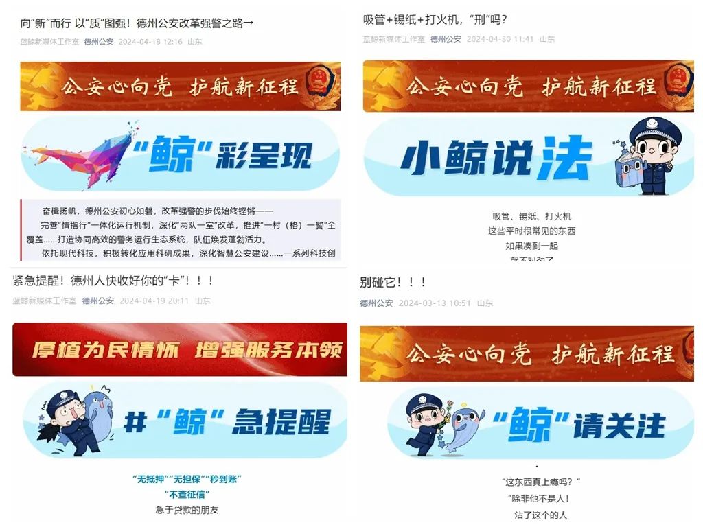 以打击治理电信网络诈骗、传统“盗抢骗”等系列专项行动为重点,在融媒体矩阵推出“小‘鲸’说法”“‘鲸’彩呈现”“'鲸'急提醒”等栏目……德州公安借助喜闻乐见和诙谐幽默的网言网语,以引导主流价值观为导向,不断提升群众安全意识和防范能力。