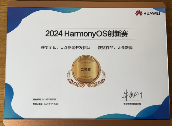 6月22日,在华为2024 HarmonyOS创新赛中,“大众”新媒体大平台旗舰客户端大众新闻荣获二等奖。本次大赛由来自全球的2000个开发团队参加,不分行业、地区,全国共设特等奖1项、一等奖5项、二等奖7项、三等奖10项、场景创新奖12项。大众新闻是地方媒体所获最高奖。同日,在华为“千帆共进,智启星海”主题颁奖活动中,大众新闻荣获鸿蒙先锋卓越创新奖。大众报业集团与新华社作为媒体代表,率先上线鸿蒙元服务,为广大用户带来更快捷、更智慧的新闻阅读新体验。大众新闻作为鸿蒙原生应用优秀代表获得大赛专属展区。