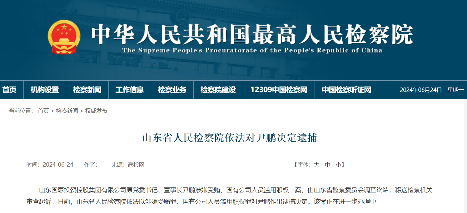 据最高人民检察院网站6月24日消息,山东国惠投资控股集团有限公司原党委书记、董事长尹鹏涉嫌受贿、国有公司人员滥用职权一案,由山东省监察委员会调查终结,移送检察机关审查起诉。日前,山东省人民检察院依法以涉嫌受贿罪、国有公司人员滥用职权罪对尹鹏作出逮捕决定。该案正在进一步办理中。