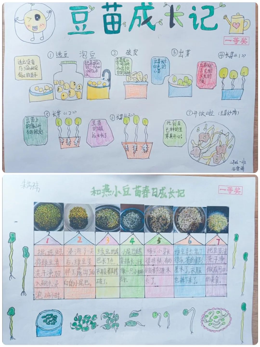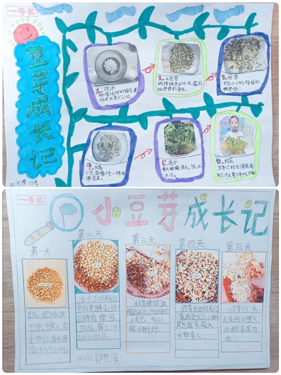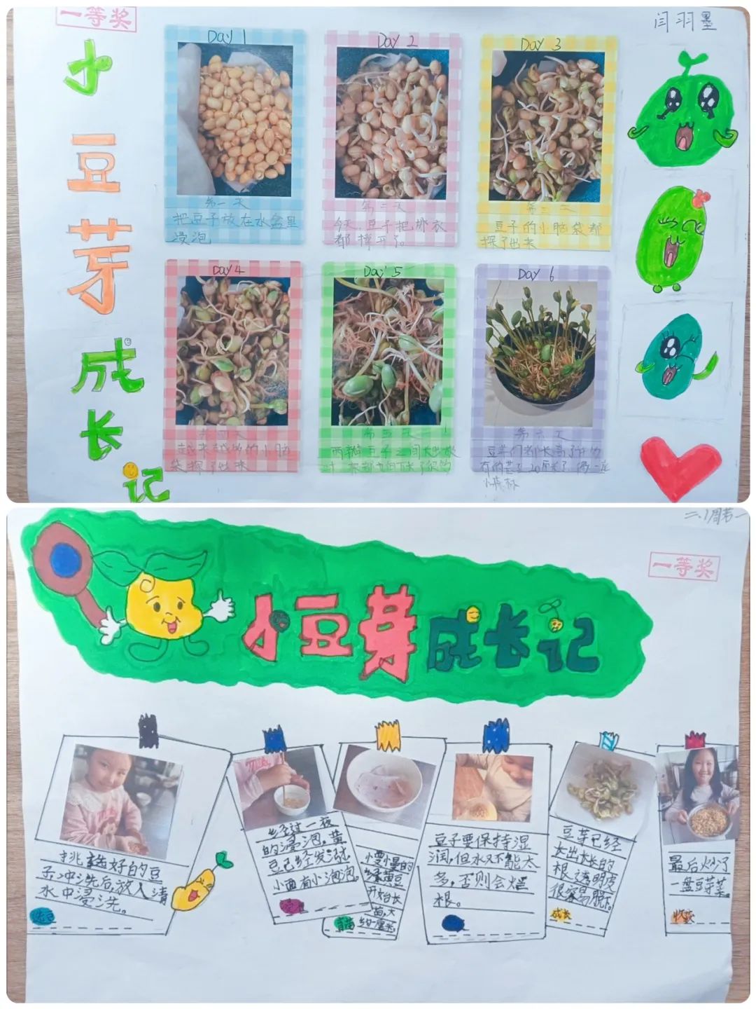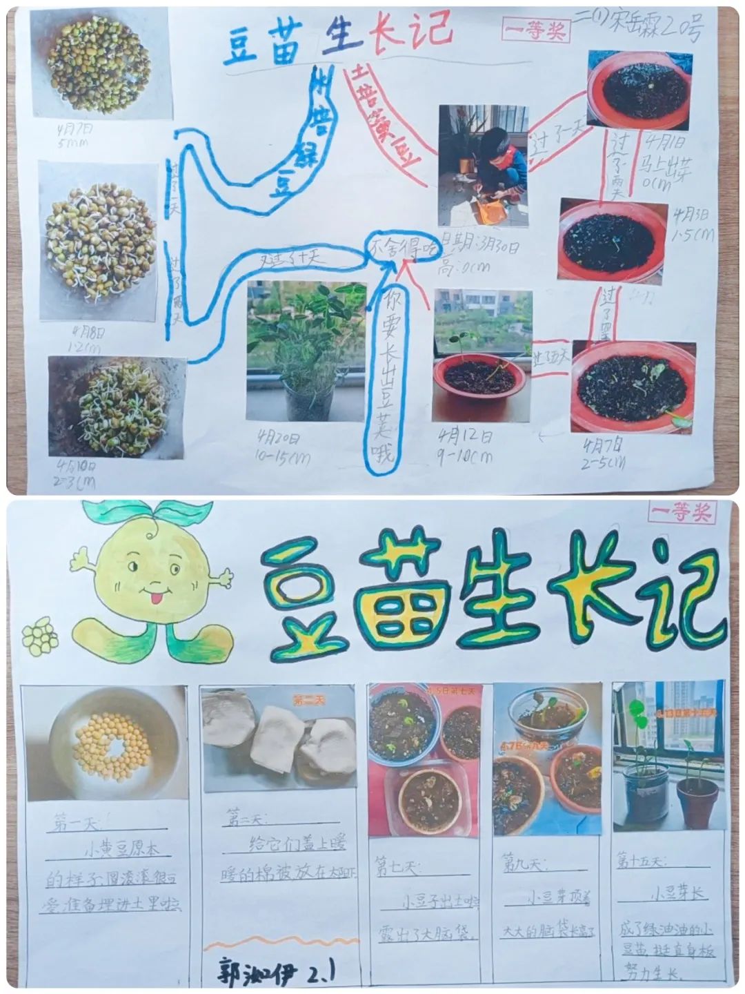 同学们在家里开始尝试水培豆芽,并观察记录小豆苗的成长与变化。