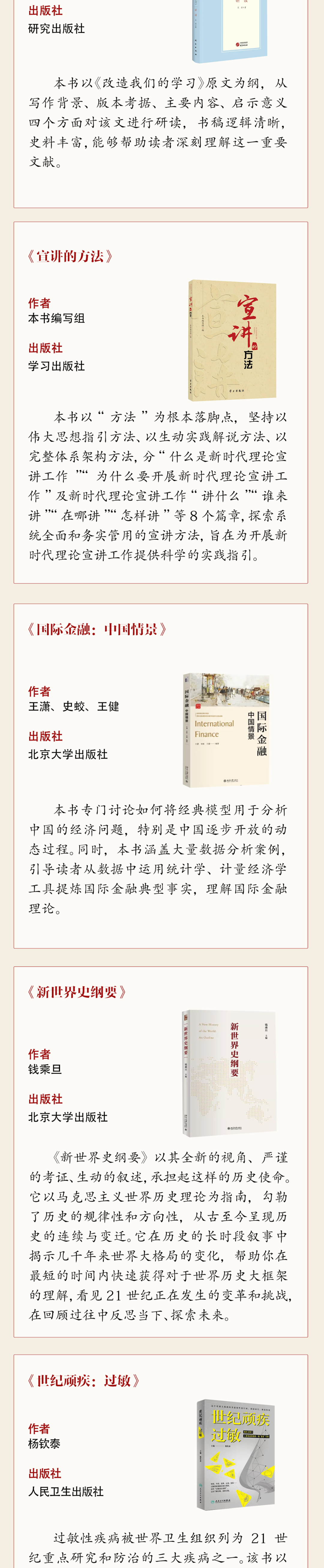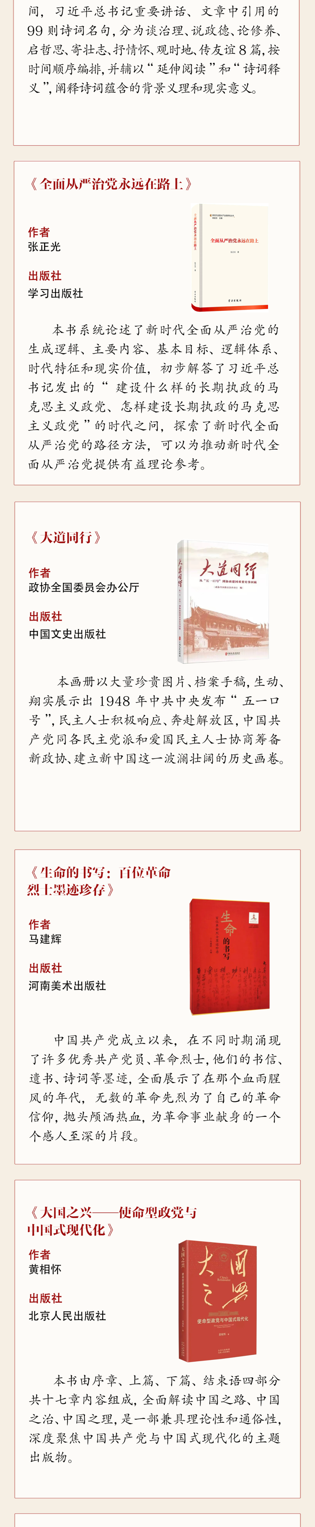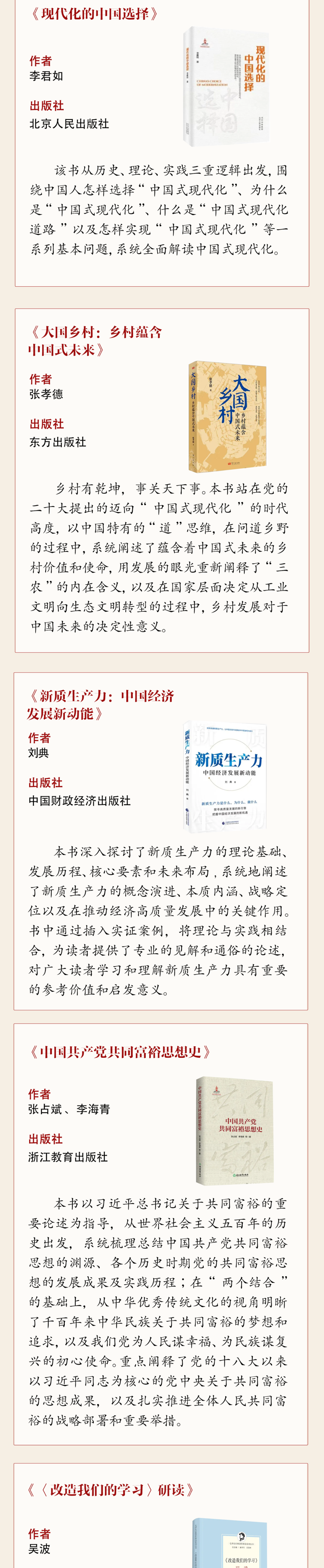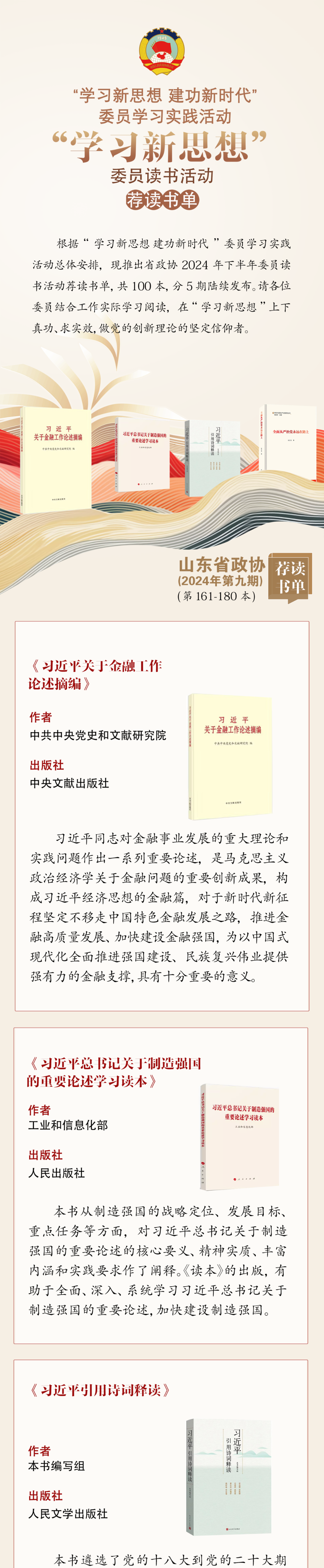 根据“学习新思想 建功新时代”委员学习实践活动总体安排,现推出省政协2024年下半年委员读书活动荐读书单,共100本,分5期陆续发布。请各位委员结合工作实际学习阅读,在“学习新思想”上下真功、求实效,做党的创新理论的坚定信仰者。