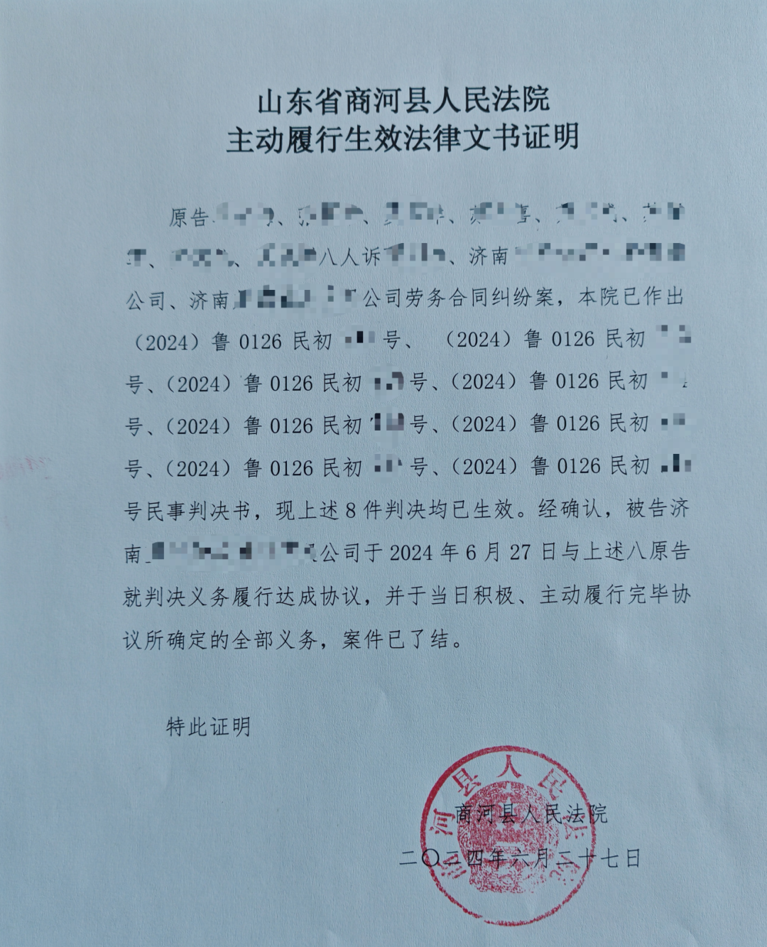 商河县人民法院已作出生效判决的8起劳务合同纠纷案件,经立案庭徐兆瑞速裁团队主持调解,被告甲公司与8名劳务工人达成协议,主动履行生效判决确定的义务,共支付8名工人劳务费16万余元。商河县人民法院向被告甲公司发出《主动履行生效法律文书证明》。