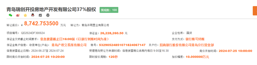 近日,青岛瑞创开投房地产开发有限公司37%股权转让公告发布,转让方是青岛开明置业有限公司,转让底价约8743万。信息披露起止日期为2024-06-27至 2024-07-24,竞价开始时间为2024-07-25 10:20:00。