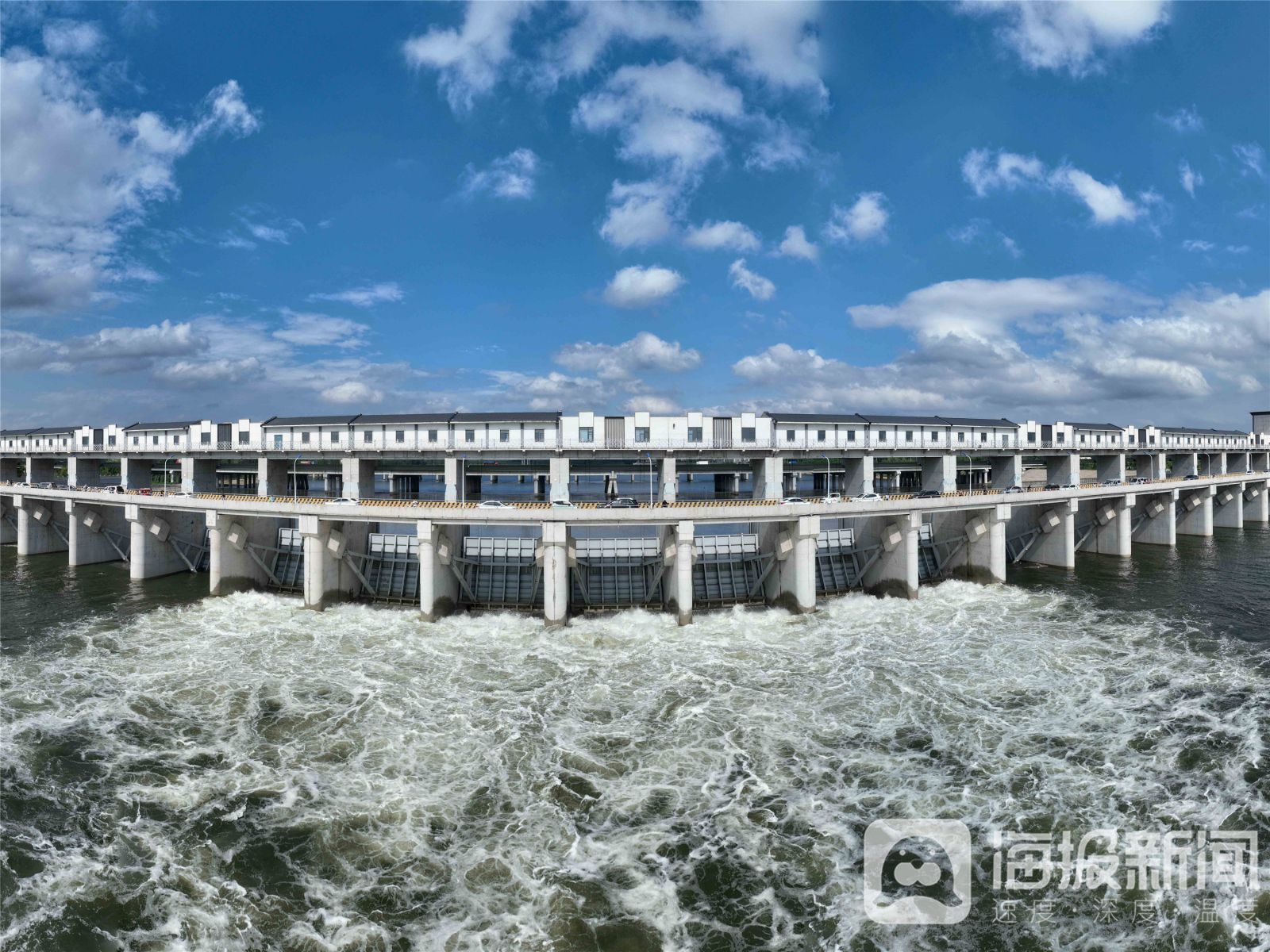 《沂河开闸泄洪应对强降雨》2024年7月6日,位于山东省临沂市郯城县马头镇境内的沂河马头闸开闸泄洪。受连日强降雨的影响,临沂市沂河马头闸开闸泄洪,减轻上游抗洪压力,全力保障人民群众生命和财产安全。房德华摄