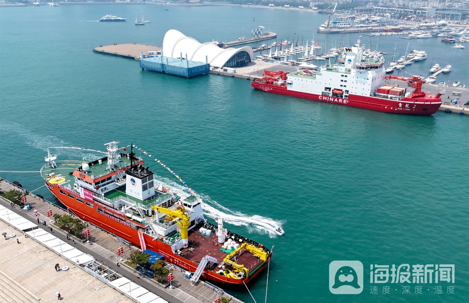 《“雪龙2”号和“极地”号破冰船亮相青岛并向公众开放参观》2024年7月3日, “雪龙2”号极地考察破冰船和“极地”号破冰调查船在青岛奥帆中心码头向公众开放参观。其中,“极地”号是由我国自主设计、自主建造的新一代破冰调查船,于6月24日正式命名交付后首次面向公众开放参观。开放日结束后,中国第14次北冰洋考察队暨“雪龙2”号、“极地”号将从青岛启航出征。张进刚摄