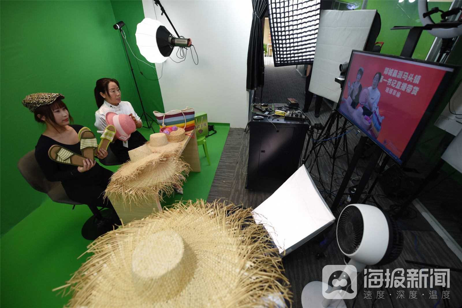 《助力村民“种草致富”》2024年7月1日,在山东省临沂市郯城县马头镇草编合作社,郯城县派第一书记吕侠(右)帮助农民用直播的方式推销用黄草编织的工艺品。眼下,6000余亩黄草进入收获季节,合作社社员忙着收割晾晒、编织成草帽、草鞋等工艺品出口创汇。当地采取“党支部+合作社+基地+电商+农户”的经营形式,将草编工艺品销往日本、韩国等十多个国家和地区,带动周边1000多人通过种植、编织黄草走上了致富道路。房德华摄