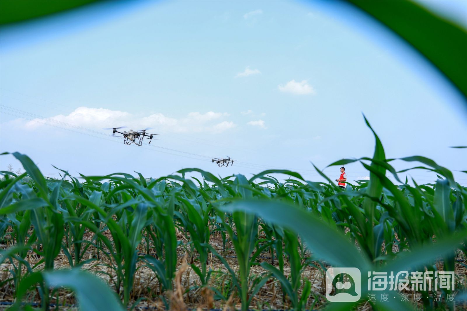 《玉米科学管护 助力增产增收》2024年7月4日,在山东省聊城市茌平区温陈街道的一片粮油绿色高产高效示范田里,农民正操作植保无人机进行玉米控旺作业。据了解,该示范田采用玉米密植精准调控技术,平均亩产可达900公斤左右,产量比普通种植方式提升15%以上。运用科技力量,确保秋粮丰产丰收。马红坤摄