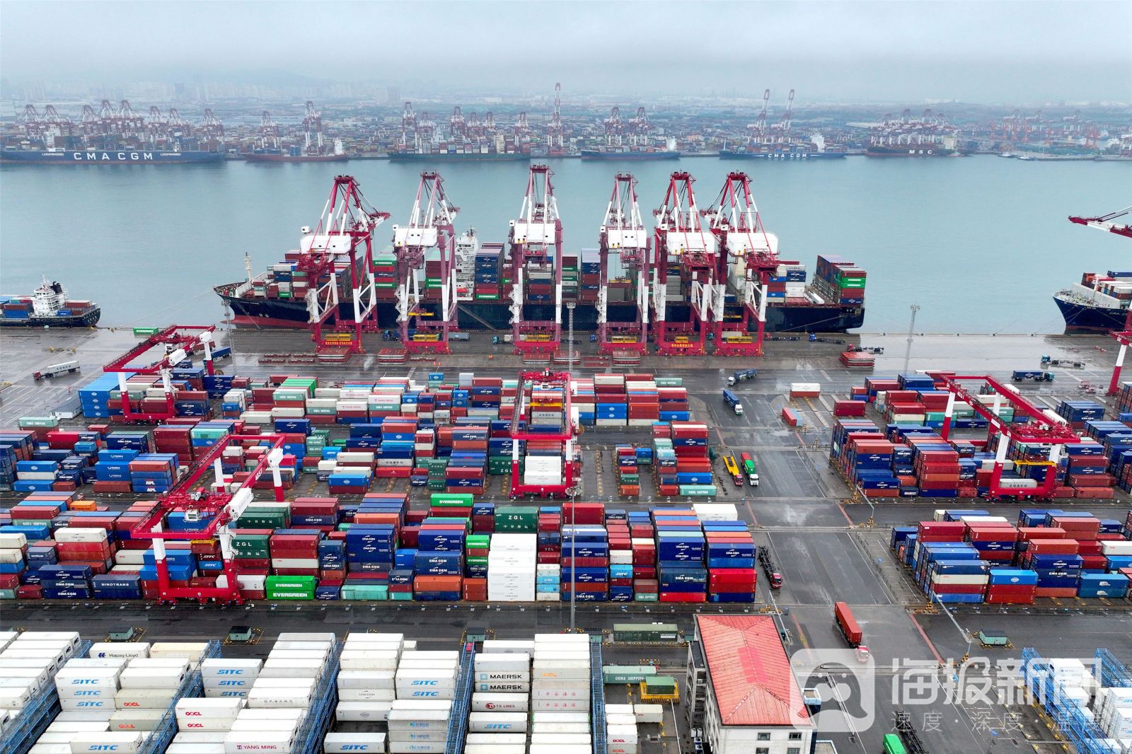 《雨季港口生产忙》2024年7月7日,山东港口青岛港在做好雨季安全保障的同时,抓紧港口生产。车辆在雨中不停运输集装箱,国际班轮在码头有序装卸集装箱。工作人员加强安全巡视,确保雨季港口生产和口岸安全。俞方平摄