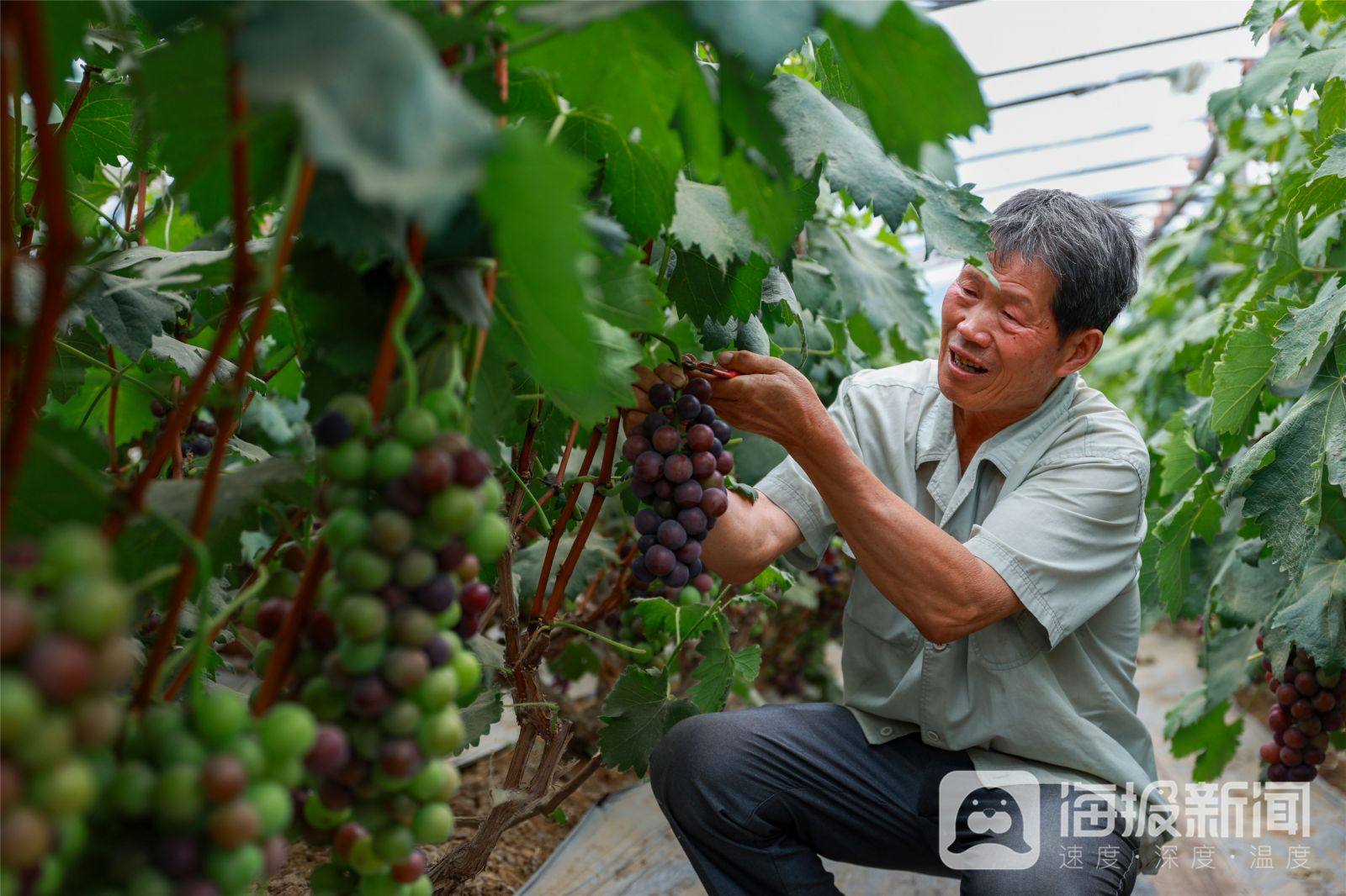 《盛夏时节果飘香》2024年7月1日,在山东省聊城市茌平区乐平铺镇后常村,农民在采摘葡萄。盛夏时节,黄桃、葡萄等林果陆续成熟,当地农民抢抓农时采摘、分拣,供应市场,一派忙碌景象。近年来,茌平区以“一村一品”模式积极调整农业产业结构,持续壮大特色林果产业,坚持规模化种植、品牌化经营,使特色林果产业逐渐成为助农增收的新引擎,为乡村振兴注入了新活力。马红坤摄