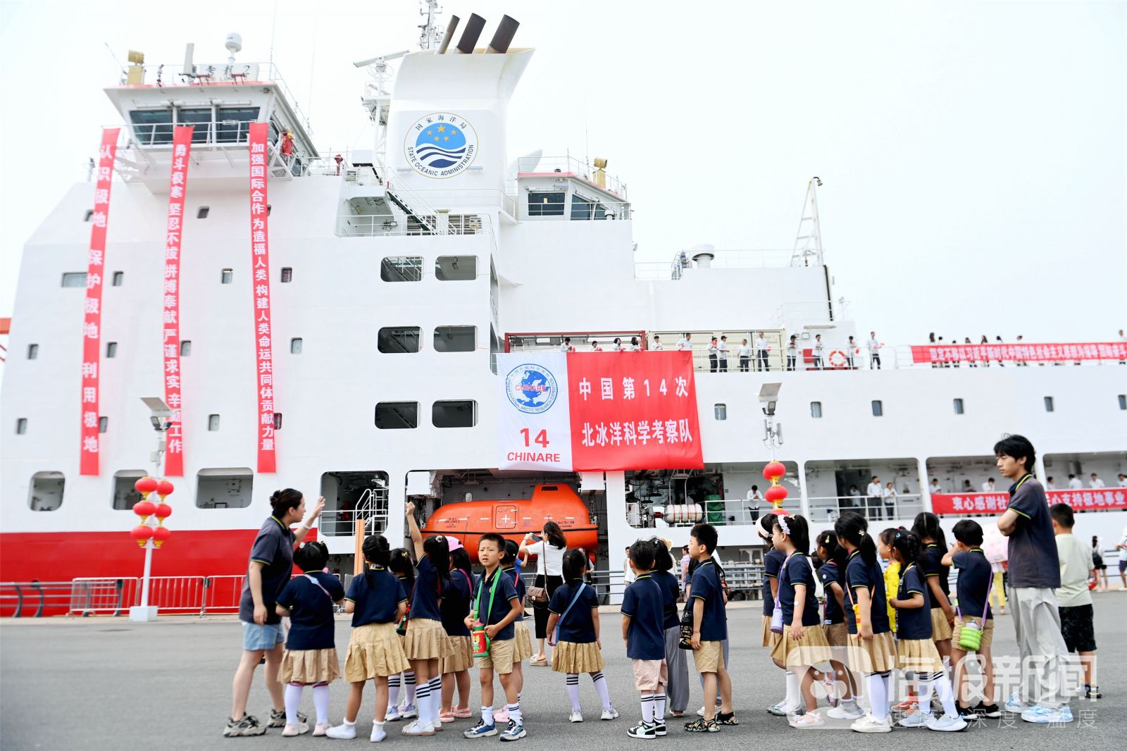 《中国第14次北冰洋考察队启航出征》2024年7月5日,中国第14次北冰洋考察队暨“雪龙2”号、“极地”号从山东省青岛奥帆中心码头启航出征北冰洋,众多市民和游客以及科研单位工作人员前来送别。当日,幼儿园小朋友在参观雪龙2号科考船。俞方平摄