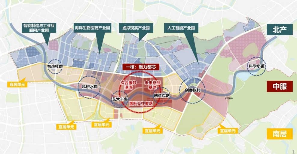 第一个层级是28.5平方公里全域范围。规划为“北产、中服、南居”的总体布局,其中,北部以株洲路为轴,构建智能制造与工业互联、海洋生物医药、虚拟现实、人工智能四大产业组团;中部沿张村河两岸,打造产城融合的公共服务与活力带;南部以合肥路为轴形成六大宜居组团。全域规划坚持“在地性、未来性、人本性”三大核心理念。