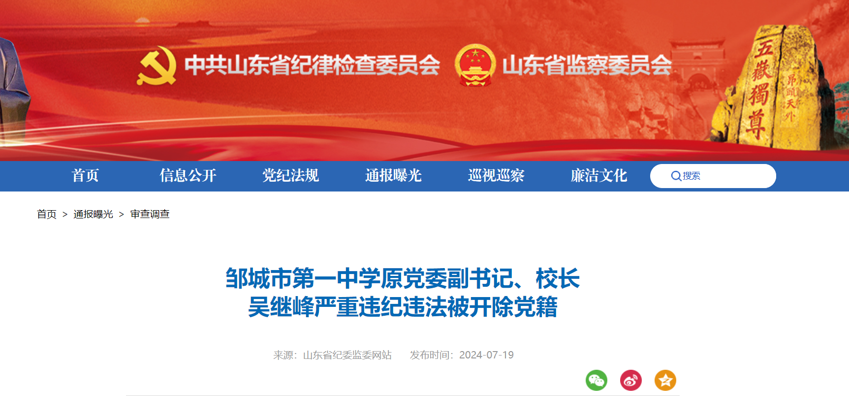 据山东省纪委监委网站7月19日通报,邹城市第一中学原党委副书记、校长吴继峰严重违纪违法被开除党籍。