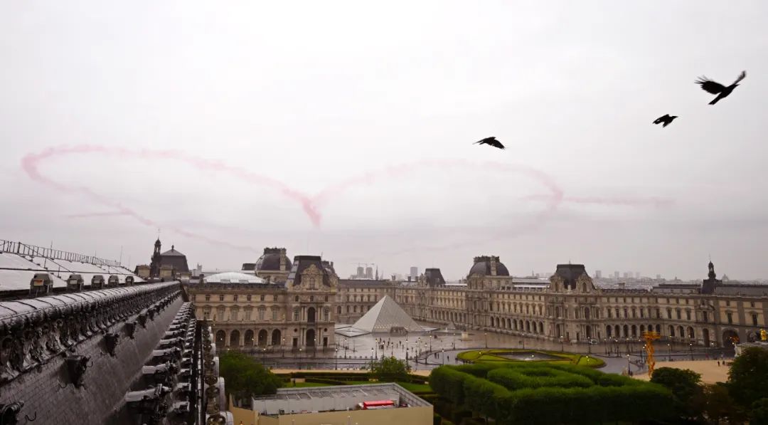 开幕式上飞机拉出的心形烟雾漂浮在巴黎圣母院上空