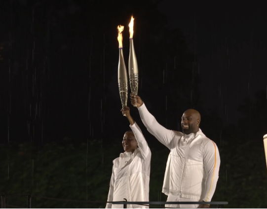 蒙面火炬手将火炬交给法国传奇球星齐达内,齐达内再交给网球运动员纳达尔,纳达尔与网球明星小威廉姆斯、罗马尼亚体操传奇科马内奇、美国田径名宿卡尔·刘易斯同船而行,驶向位于杜乐丽花园的火炬塔。