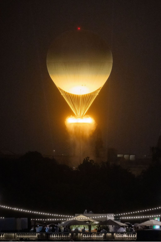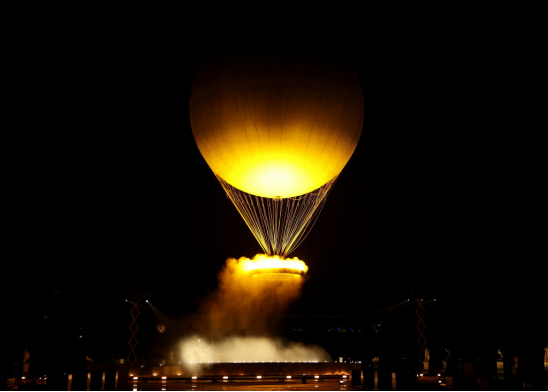 主火炬顶部是一个高30米、直径22米的热气球。241年前,人类首次氢气球飞行在这里开启。经过最后几棒传递,法国柔道奥运会冠军特迪·里内和法国田径奥运会冠军玛丽-若泽·佩雷克走向火炬塔,点燃火焰环,热气球缓缓腾空,火炬点亮整座城市。与病魔作斗争的著名歌手席琳迪翁在埃菲尔铁塔下纵情高歌,充满力量的歌声响彻全场。