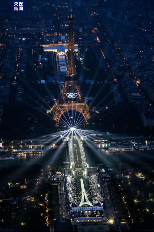 伴随着奥林匹克会歌,会旗缓缓升起。镜头拉远,开幕式主会场特罗卡德罗广场的舞台变成了埃菲尔铁塔的形状。