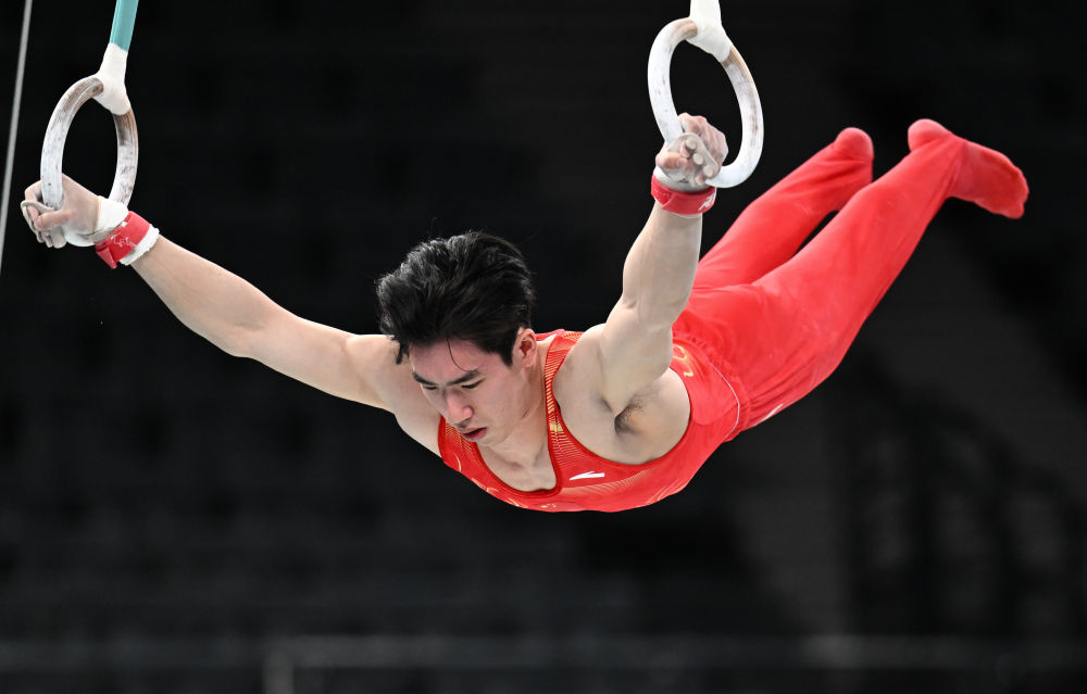 7月24日,中国队选手张博恒在进行吊环项目训练。当日,中国男子体操队在巴黎进行赛台训练。新华社记者 程敏 摄