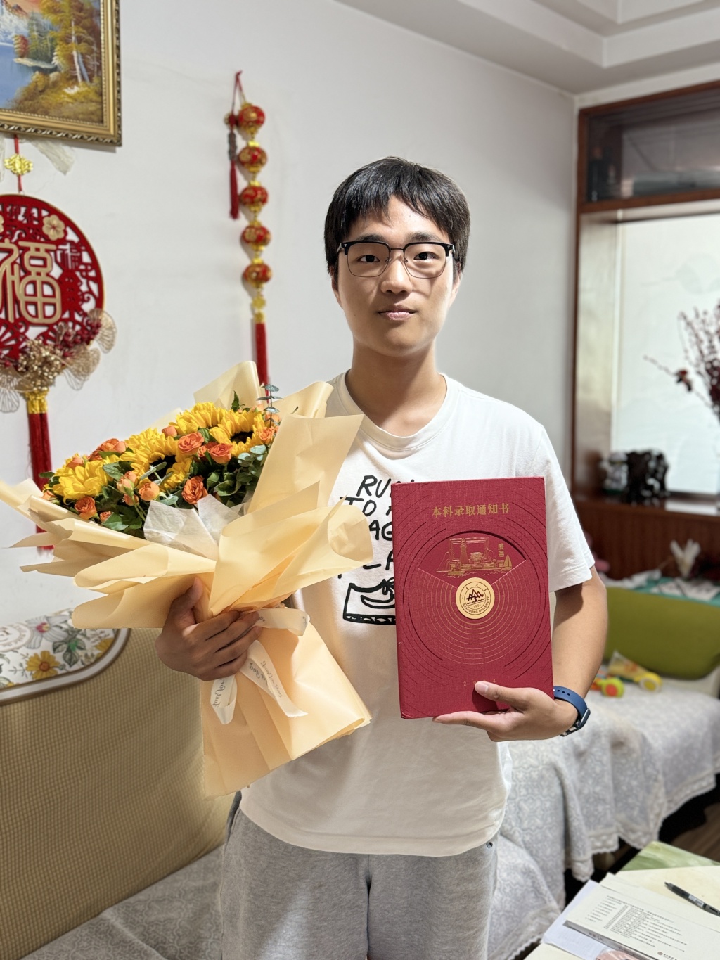 王磊的想法得到了同事们的一致支持。于是,7月29日一大早,王磊来到投递部,很快分拣到了儿子的录取通知书。“我们家离投递部很近,开车10分钟左右就到了,崂山分公司的领导给儿子准备了花束,同事亲自开车把我送回家,我就按照邮政的正规投递流程,把录取通知书送到了儿子手中。”王磊告诉记者。
