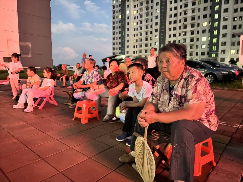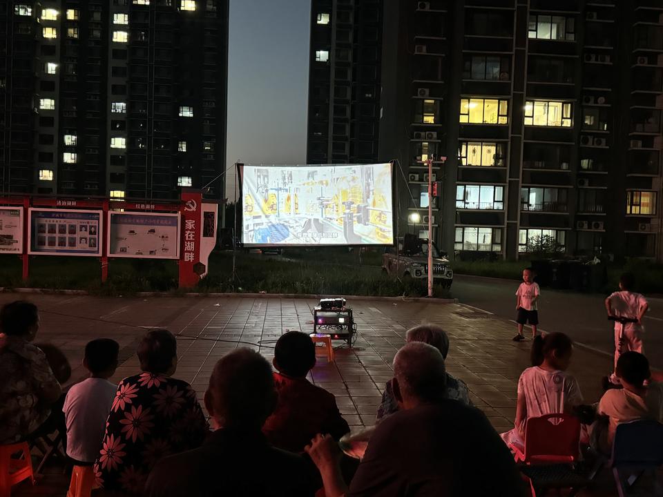 工作人员傍晚之前就布置好放映现场,夜幕降临,听说社区要播放电影,居民群众和社区儿童们早早就来到小区广场围坐在屏幕前,前来观看的群众络绎不绝,大家有说有笑地围坐在一起,等待电影开始。