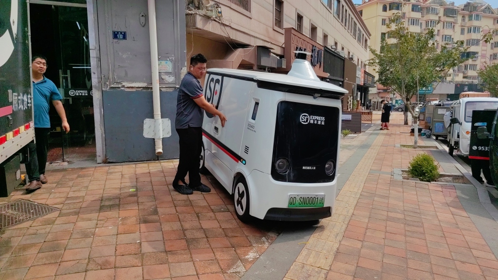 8月1日,青岛顺丰首批获得道路测试牌照的无人驾驶快递车,在经过一个多月的开放道路试运营之后,正式上路。今后,青岛顺丰无人车接驳将成为常态化运营。8月1日下午2时许,记者来到青岛顺丰古田路站点进行探访,快件放进去后手机一键就可设置。线上有安全员实时监控,1名安全员最多可管理12台车,随时准备接管。在运行的城市还有线下巡检员,负责进行应急处置问题。