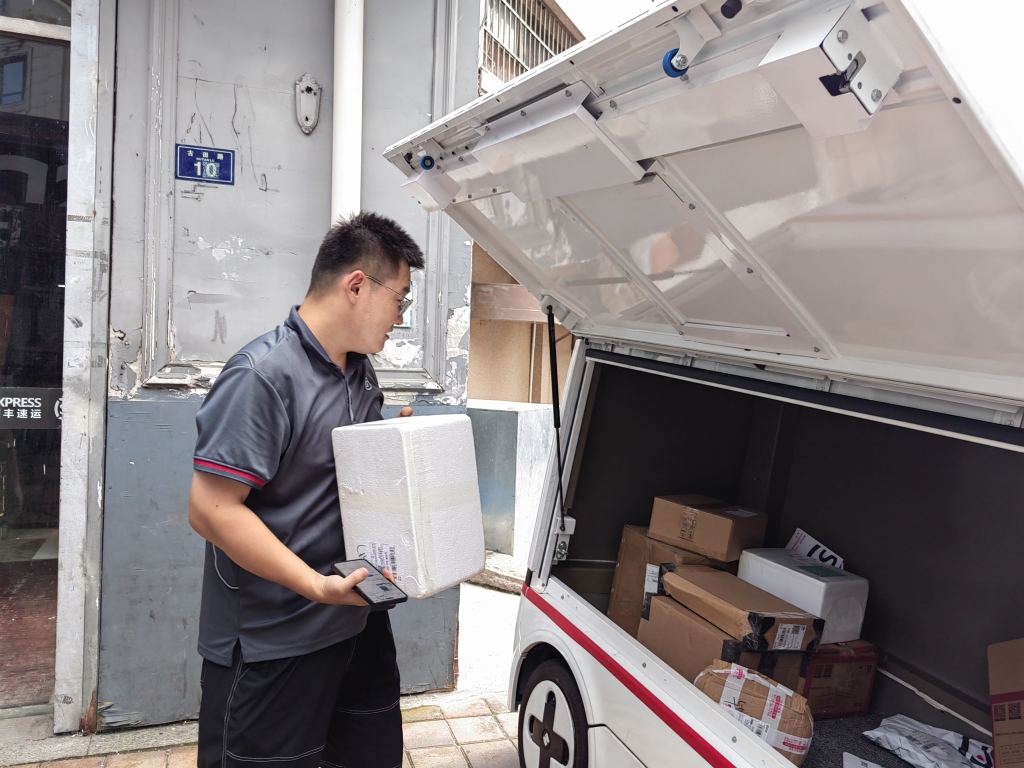 刘主管说,刚开始到时候还比较谨慎,他们一直在后台监控。车辆具备自主学习能力,系统一直在升级优化。遇到障碍物等,避障功能也越来越强大。现在,装上车以后,他们基本上不需要看管。一旦有突发情况,系统会第一时间给后台还有快递员打电话,他们会根据情况迅速接管。