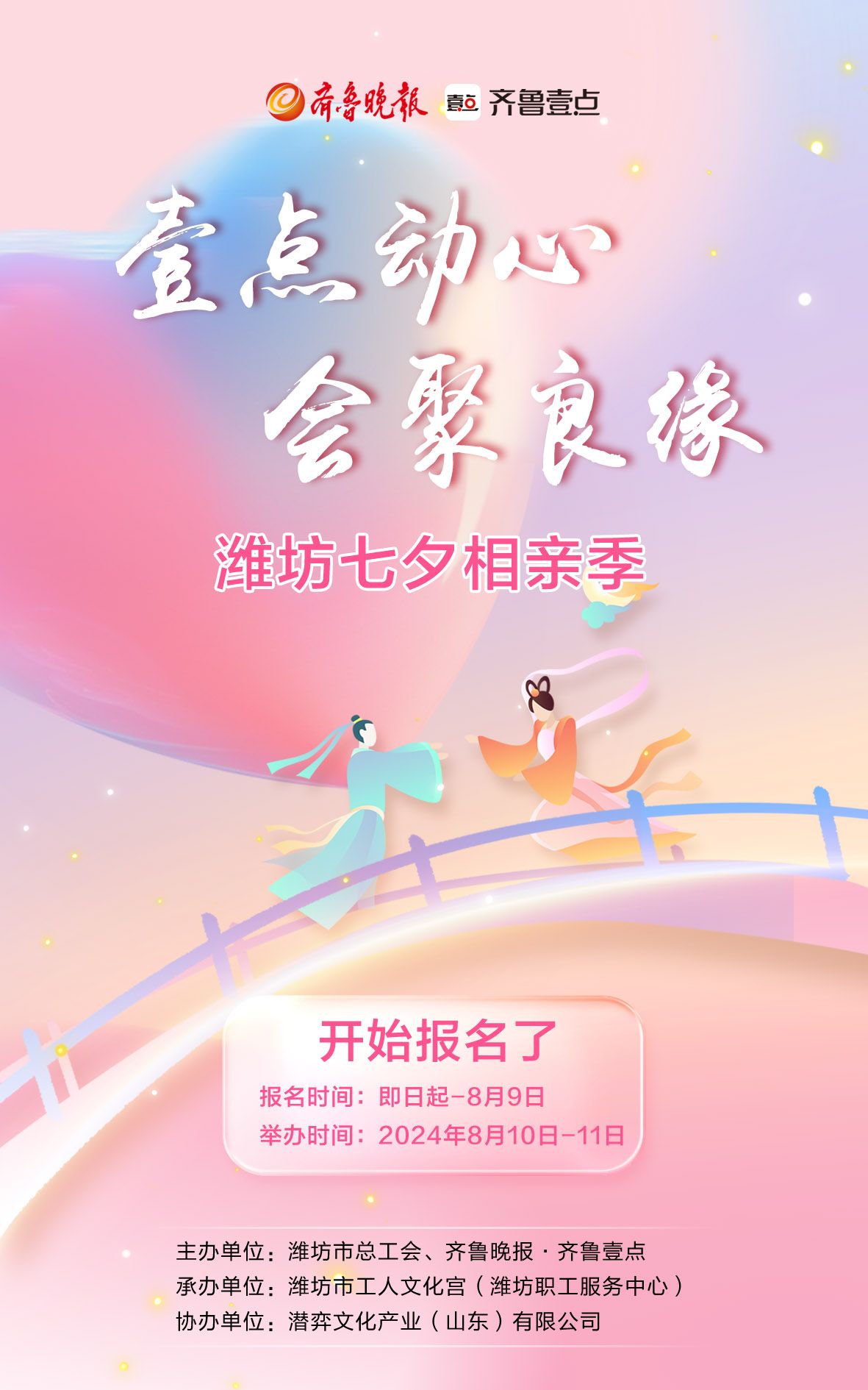为满足潍坊市青年人才婚恋交友需求,拓宽青年交友渠道,吸引青年人才安家潍坊,助力“更好潍坊”建设,在2024年七夕节即将来临之际,潍坊市总工会将于8月10日-11日举办“壹点动心·会聚良缘”潍坊七夕相亲季。