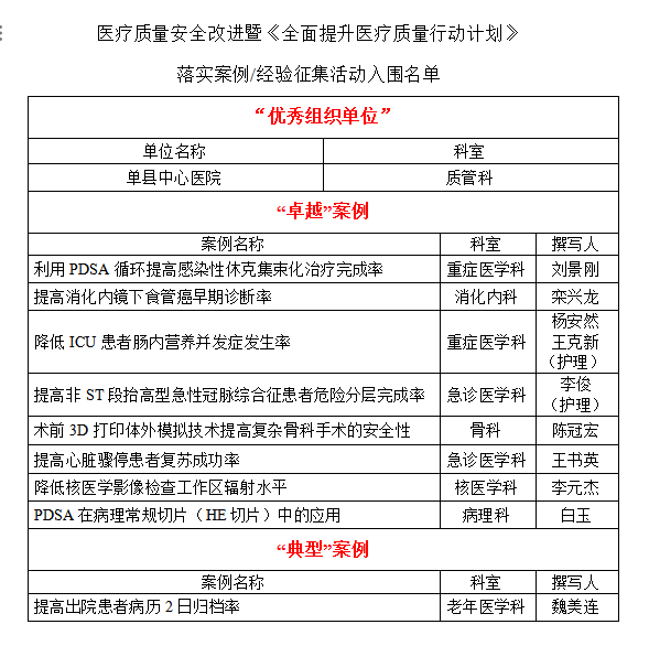 近日,国家卫生健康委医院管理研究所公布了2024年第三届“中国医疗质量大会”医疗质量安全改进暨《全面提升医疗质量行动计划》落实案例/经验征集活动入围名单,单县中心医院获评“优秀组织单位”,8个案例入围“卓越”案例,1个案例入围“典型”案例,收获颇丰。