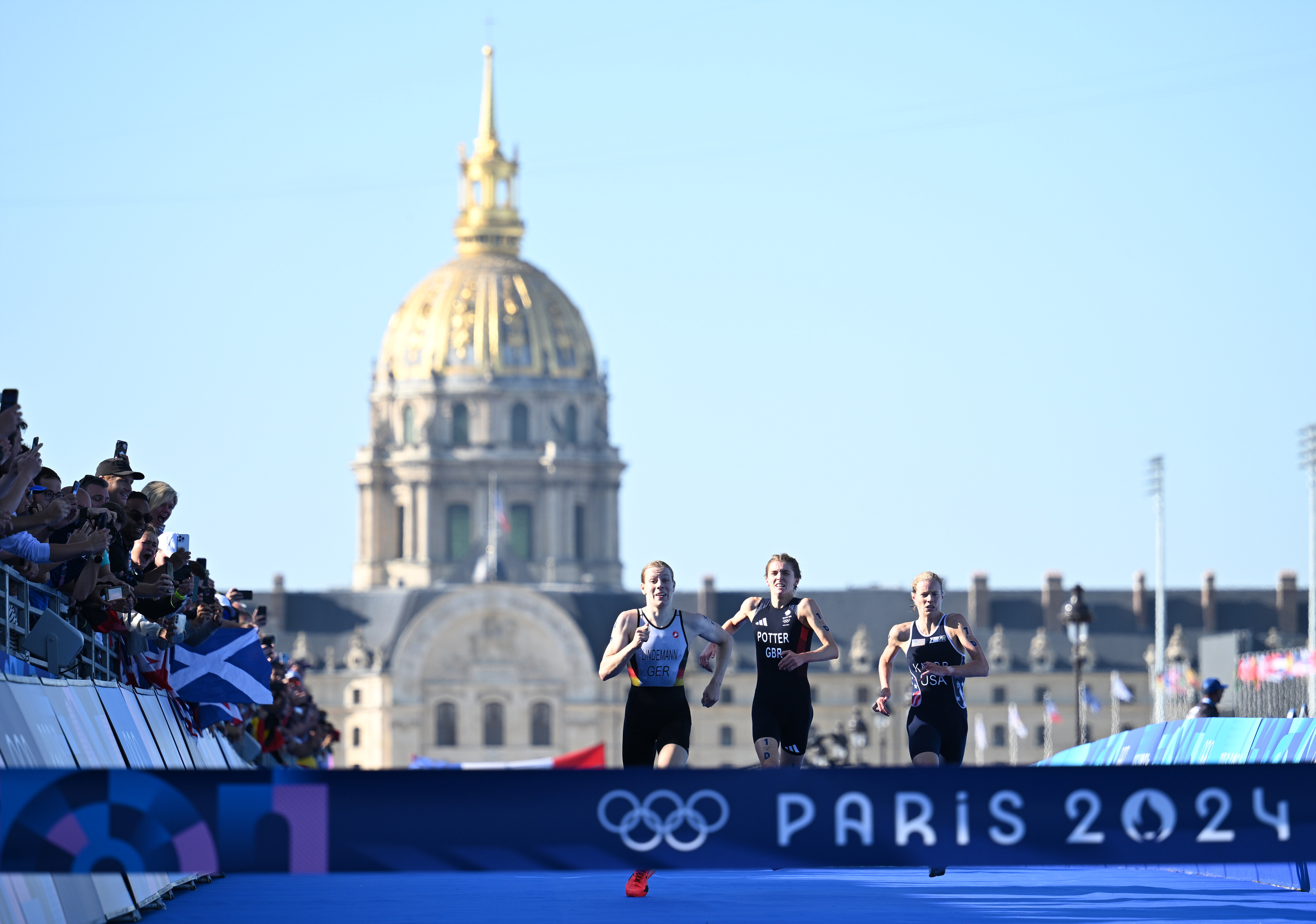 8月5日,巴黎奥运会铁人三项混合接力赛中,德国选手林德曼、英国选手波特、美国选手尼布(从左至右)在最后冲刺中。新华社记者 贺灿铃 摄