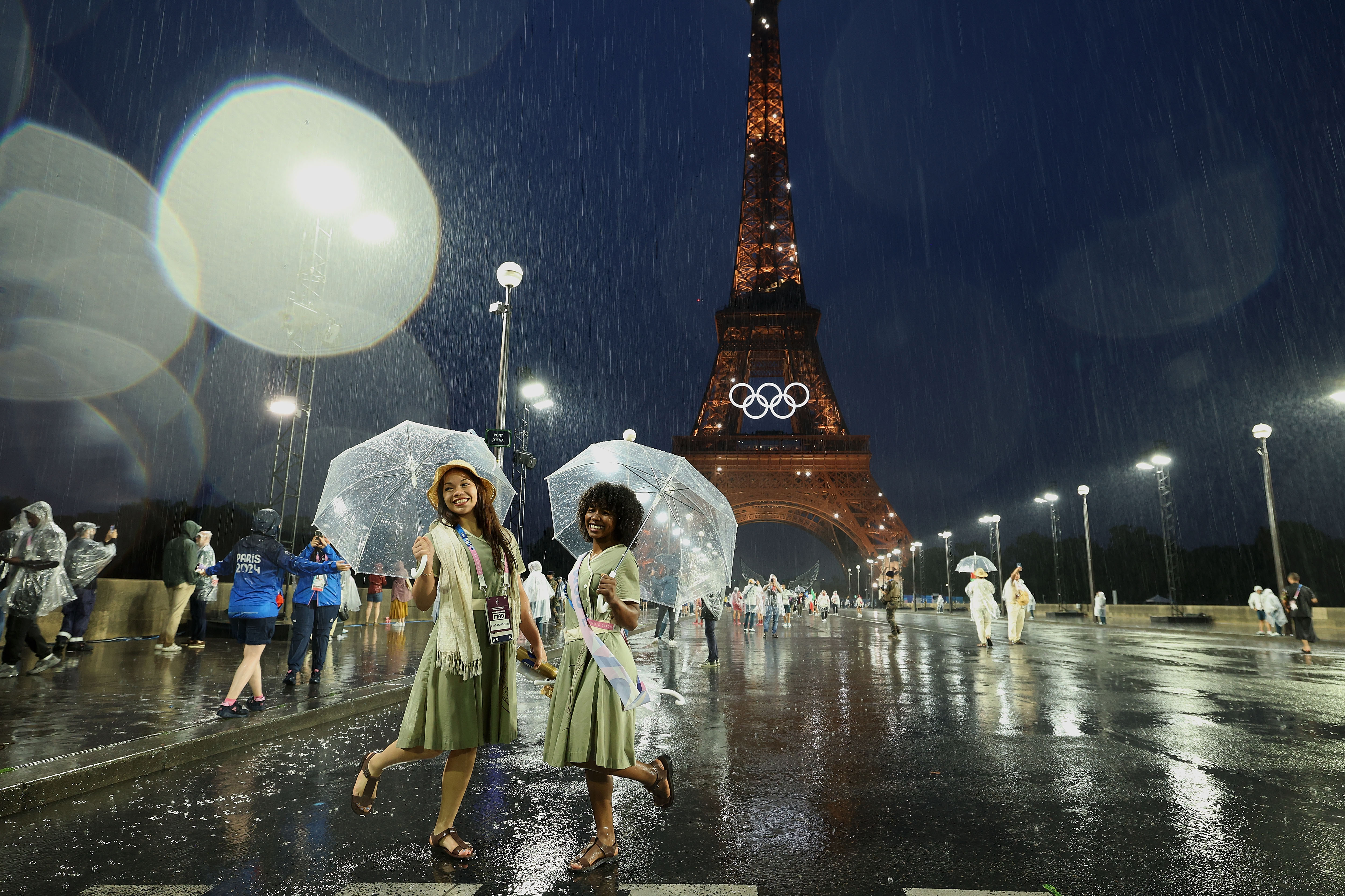 7月26日,马达加斯加体育代表团成员在埃菲尔铁塔前。当日,第33届夏季奥林匹克运动会开幕式在法国巴黎举行。新华社记者 李明 摄
