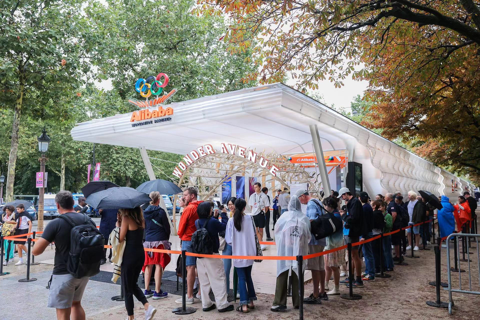 游客在巴黎香榭丽舍大街上的“阿里廊”时光胶囊排队,参与AI体验。新华社发