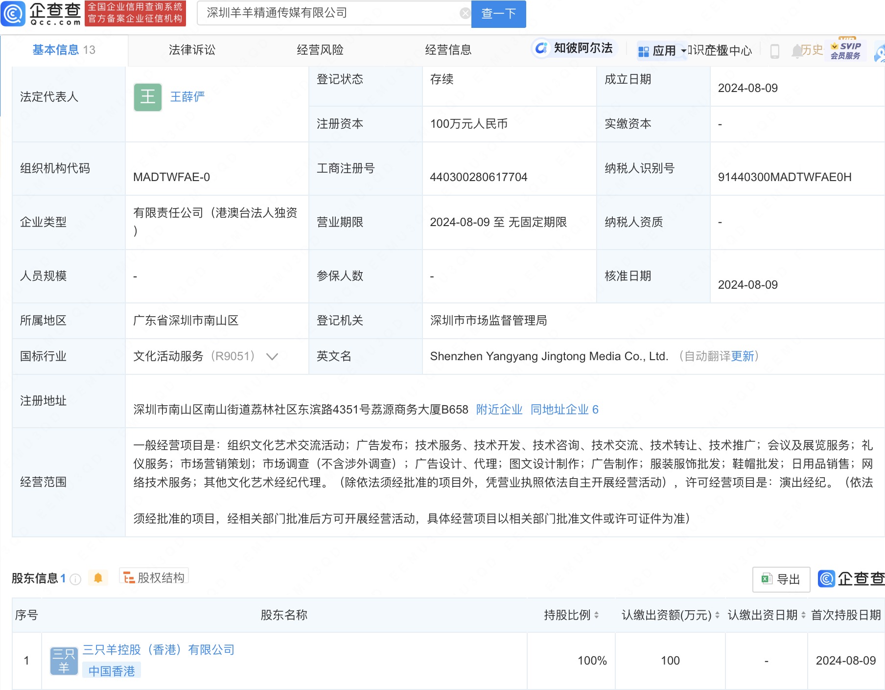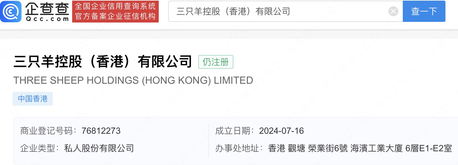 据企查查APP显示,近日,深圳羊羊精通传媒有限公司成立,法定代表人为王薛俨,注册资本100万人民币,经营范围含组织文化艺术交流活动、广告发布、网络技术服务、其他文化艺术经纪代理、演出经纪等,由三只羊控股(香港)有限公司全资持股。值得注意的是,三只羊控股(香港)有限公司也为近期成立,注册时间为7月16日。据媒体报道,近日,三只羊公司宣布其香港分公司将于8月21日正式开业。(企查查)