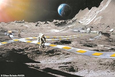 NASA曾设想在月球上建造一条铁路,利用漂浮机器人沿着柔性轨道运送材料。图片来源:NASA官网
