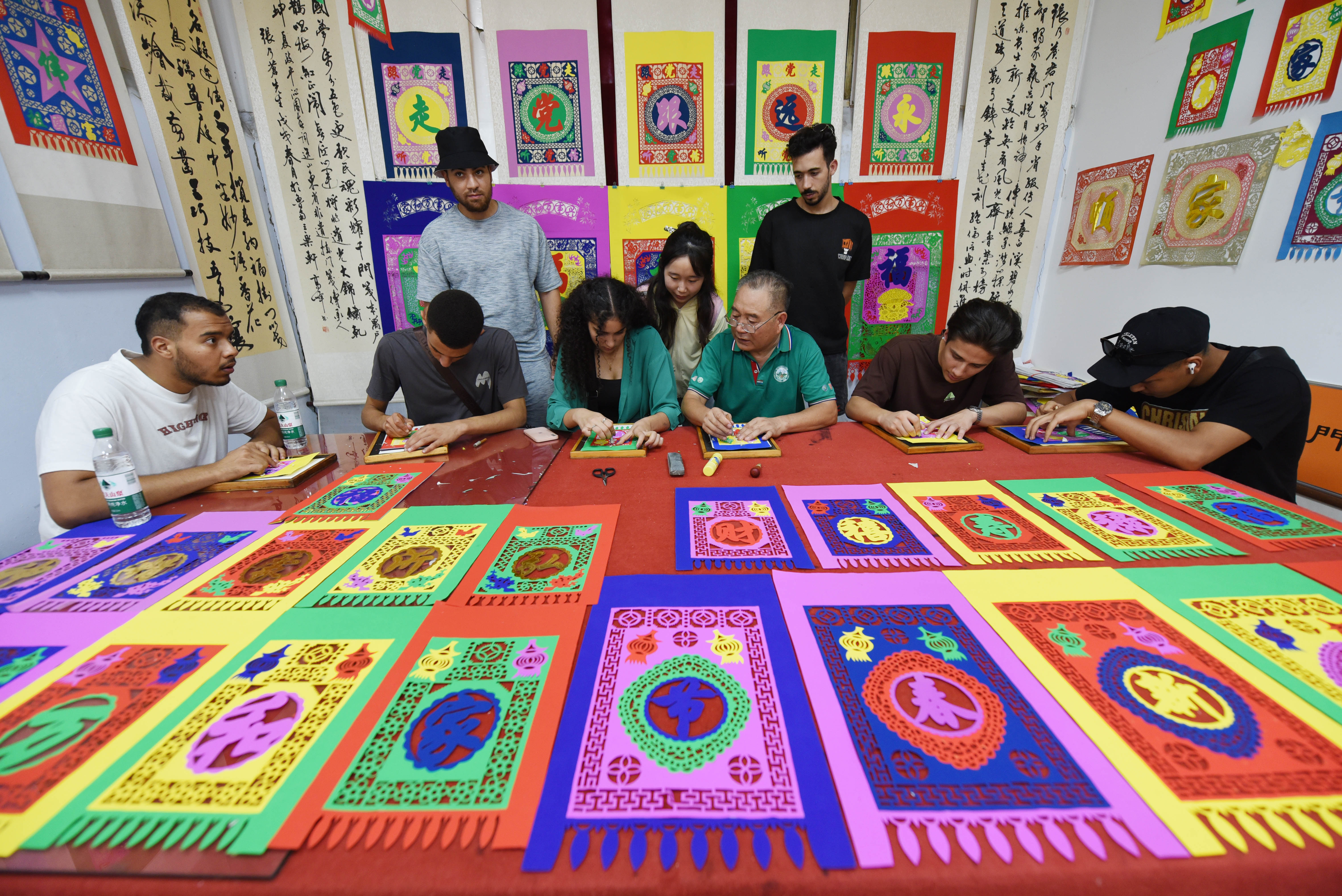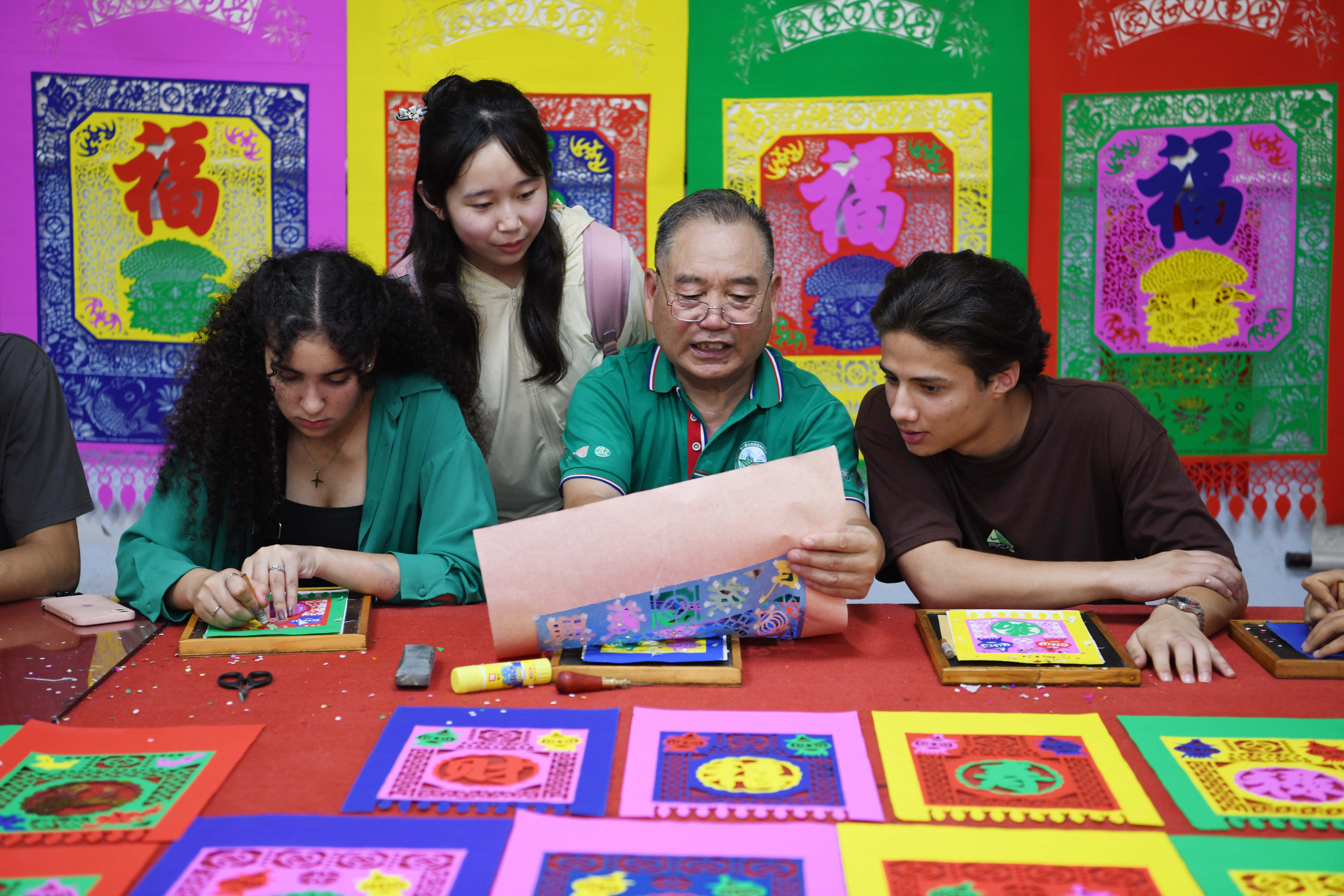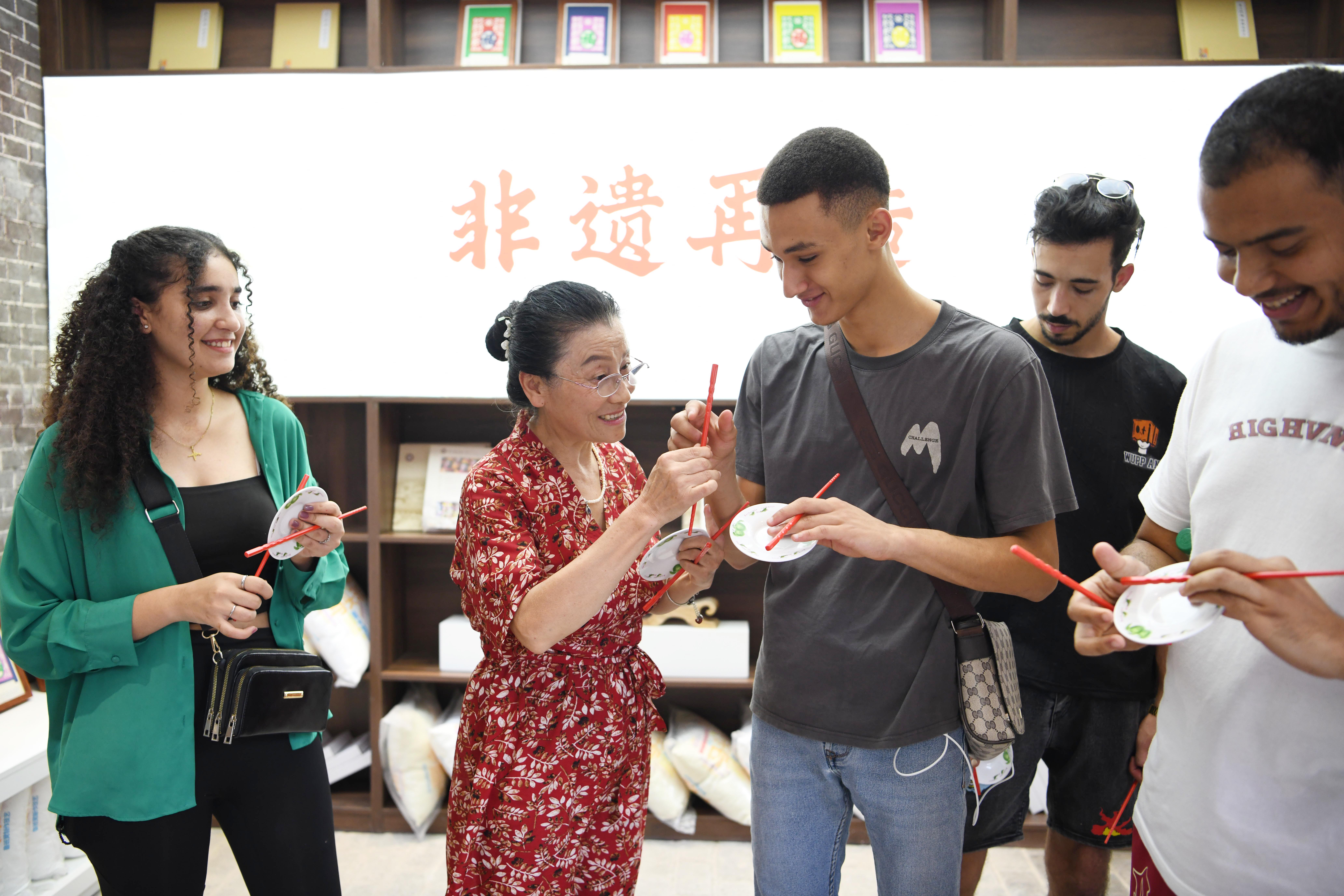 8月23日,临沂大学国际教育交流学院的外国留学生来到郯城县马头镇“非遗馆”,向张乃苍、张玲两位民间艺人学习体验郯城挂门笺、鲁南五大调等中国非遗文化,近距离感受中国传统文化的魅力。(大众新闻·齐鲁壹点记者 周青先 通讯员 房德华)
