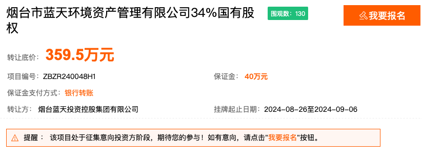 底价不变,烟台蓝天环境34%国有股权二次挂牌转让
